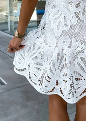 Grace and style ooze from this exquisite dress! Delicate lace adorns the neckline and dropped sleeve hems, making it a timelessly timeless piece. Rock it at any special event and watch the head-turning begin!